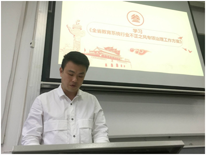 会议分为三个部分:党总支书记唐志文组织学习《习近平总书记5月2日在北京大学师生座谈会上的讲话》;党总支副书记陈洁组织学习《习近平总书记5月4日在纪念马克思诞辰200周年大会上的讲话》;党总支副许书记许梦龙组织学习《全省教育系统行业不正之风专项治理工作方案》。
