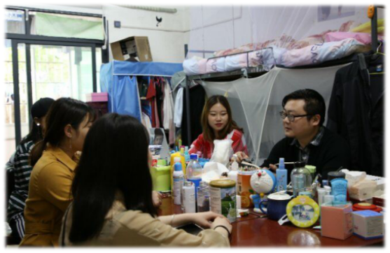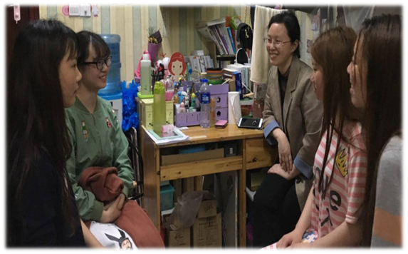 (图为西1栋活动支部书记龚红梅在学生寝室进行交谈)