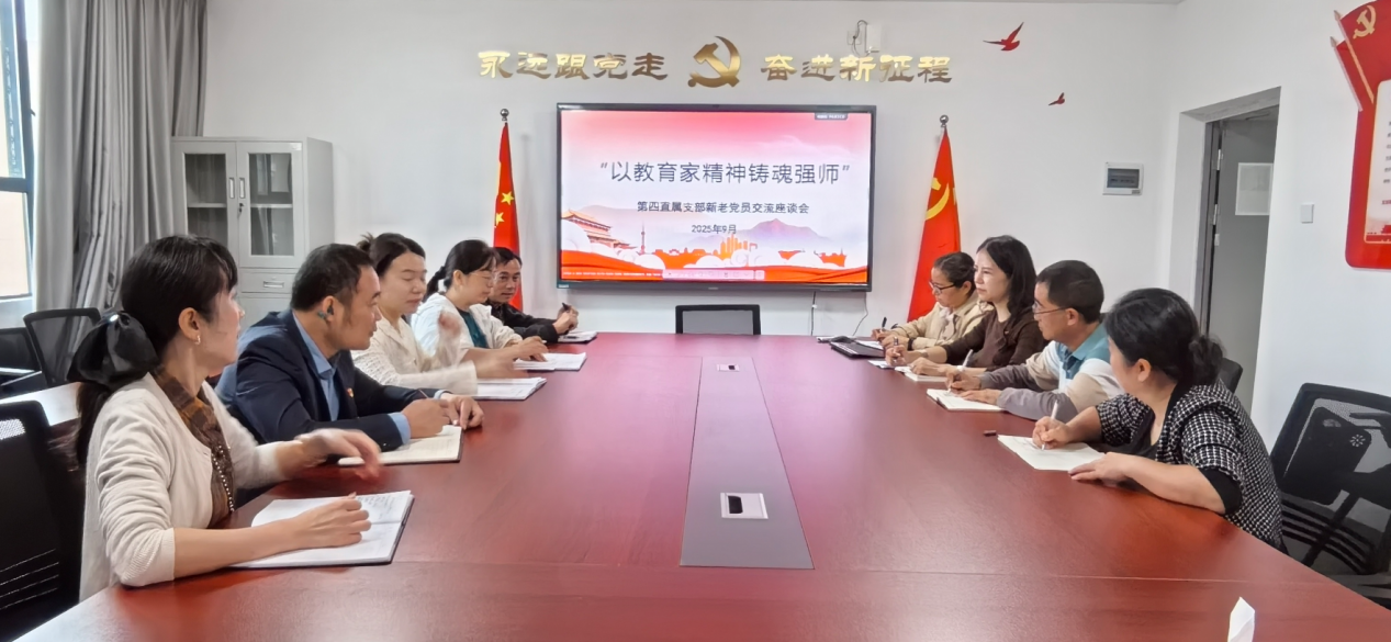 9月22日,第四直属党支部在党员活动室组织召开“一月一课一片一实践”主题党日活动,围绕“以教育家精神铸魂强师,谱写教育强国建设华章”主题,举办新老党员交流座谈会。支部各职能处室近15名党员参会,会议由第四直属党支部书记王姿琰主持。