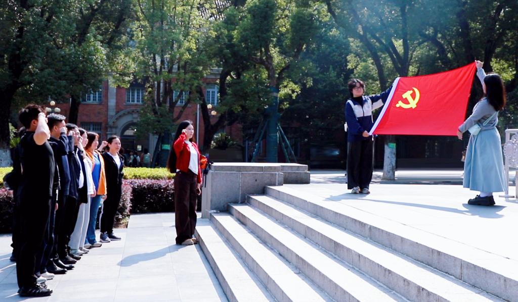 随后,一行人前往湖南大学东方红广场。广场中央的毛泽东塑像庄严肃穆,作为市级不可移动文物,其“背手凝望”的造型承载着“独立寒秋”的峥嵘记忆。全体党员整齐列队,在塑像前举起右拳,由领誓人带领重温入党誓词。“我志愿加入中国共产党,拥护党的纲领,遵守党的章程……”铿锵誓言回荡广场,既是对革命先辈的深切缅怀,更是对初心使命的庄严承诺,让每一位参与者在庄重仪式中校准价值坐标,强化使命担当。